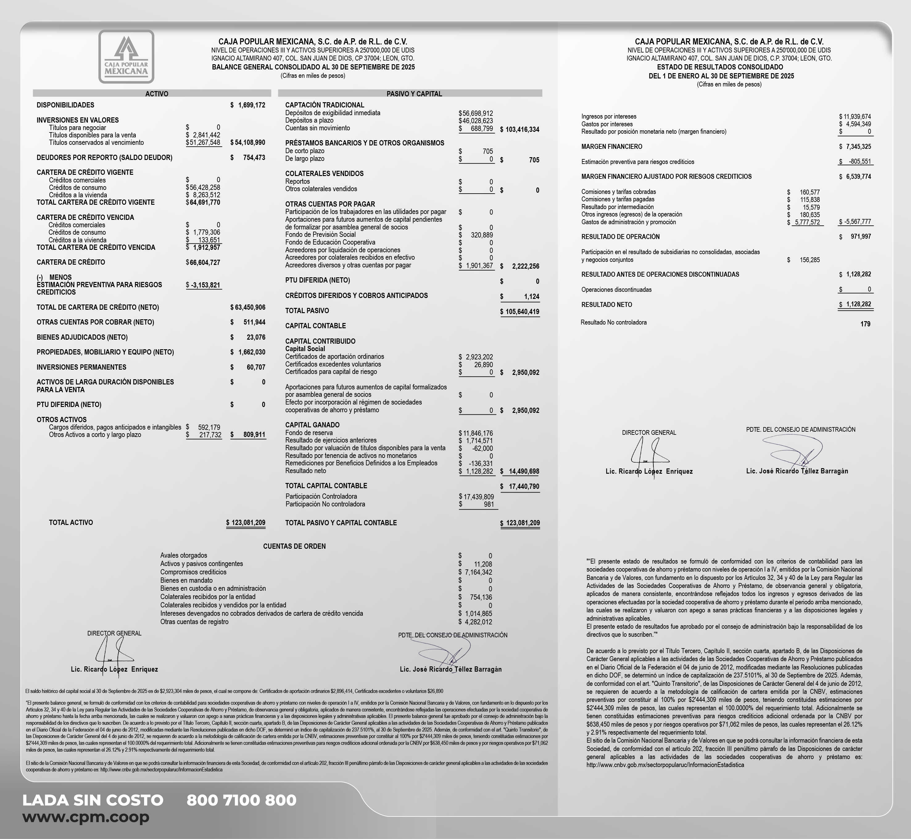 Consulta el Balance General y Estado de Resultados, con corte al 30 de septiembre de 2025 AQUÍ